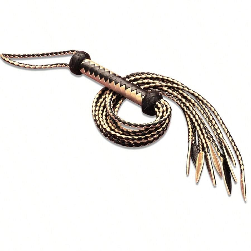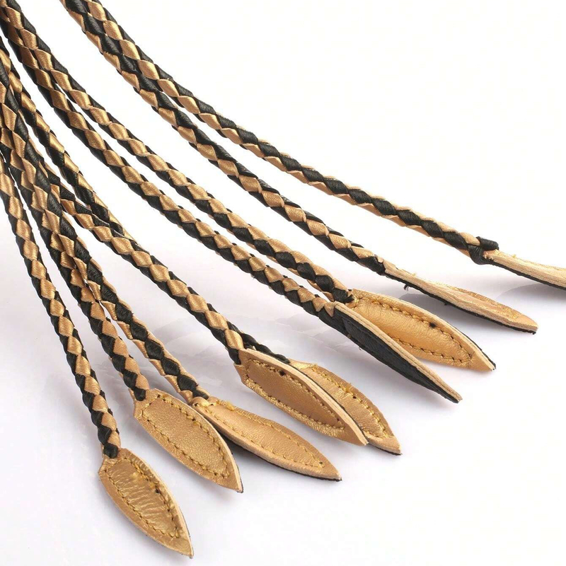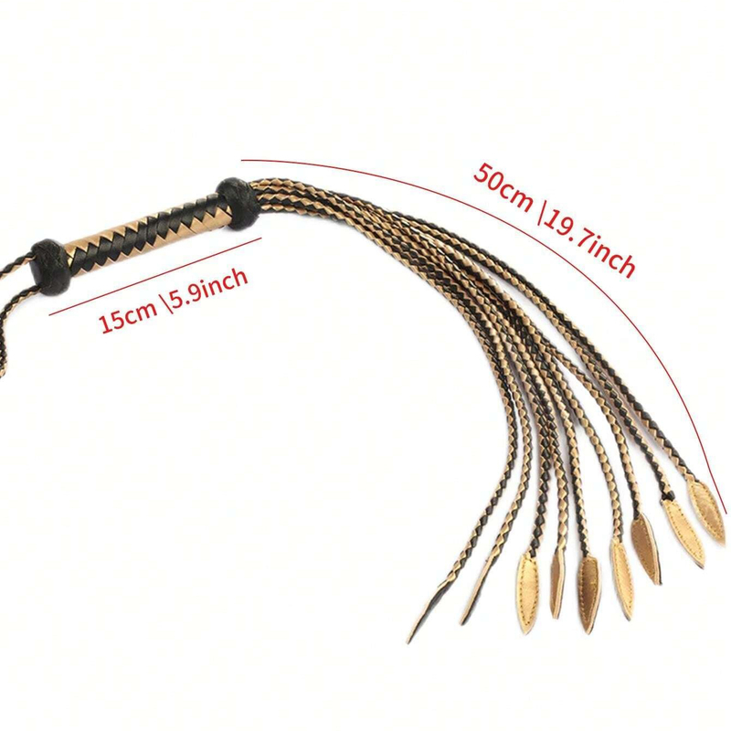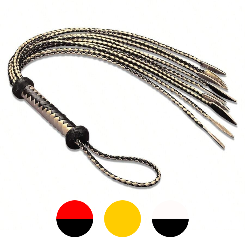 Originally, Cat whip with 9 tails was used for physical punishments in the Royal Navy and Army of the United Kingdom, and judicial punishments in many parts of the British Empire. It is called Cat O Nine Tails (Cat of Nine Tails) because this real leather whip can inflict parallel wounds, just like the claws of a cat??s paw.Material: Real LeatherColor: Golden+Black/Red+Black/White+BlackLength: 65 cm/25.6 inchHandle: 15 cm/5.9 inchPackage: OPP Bag