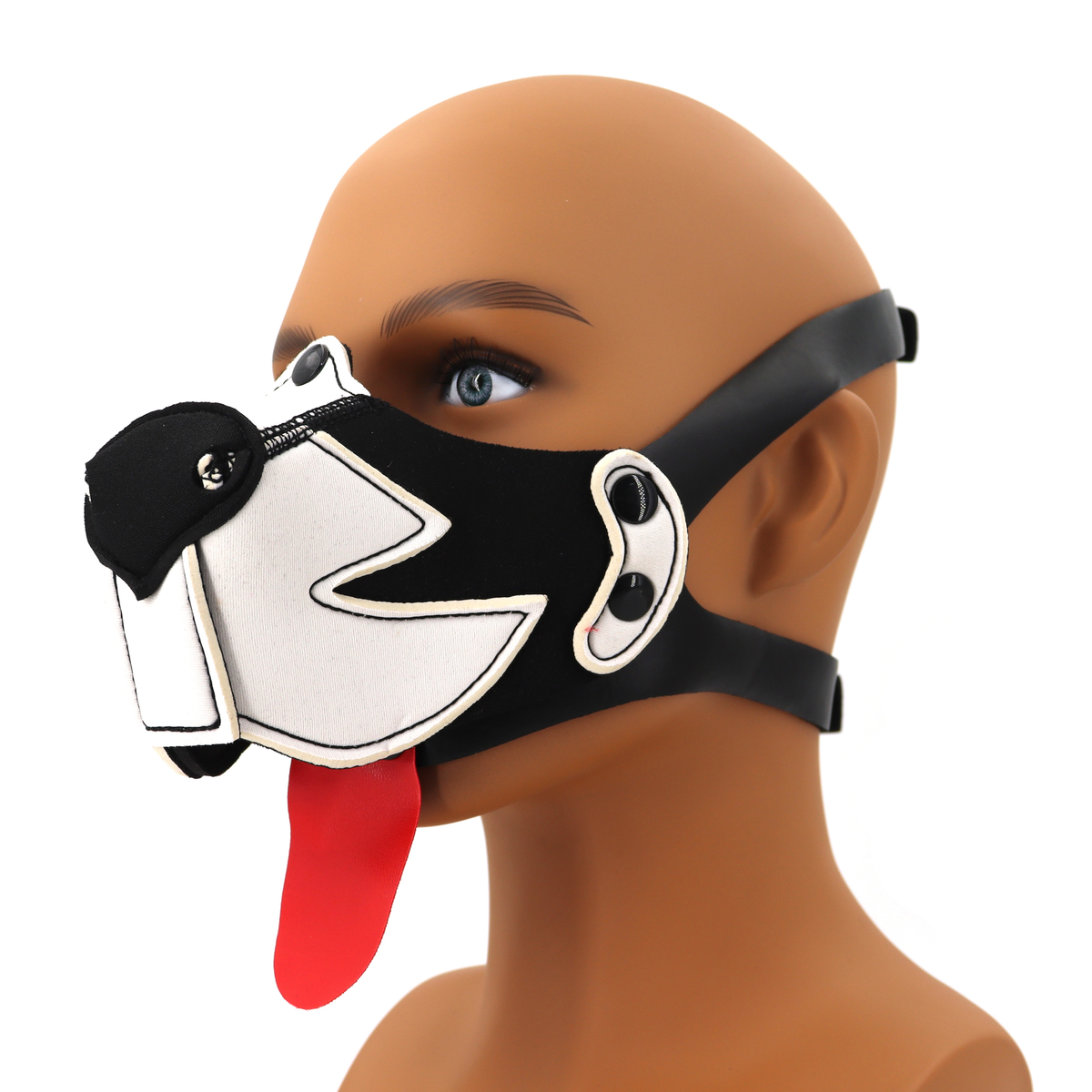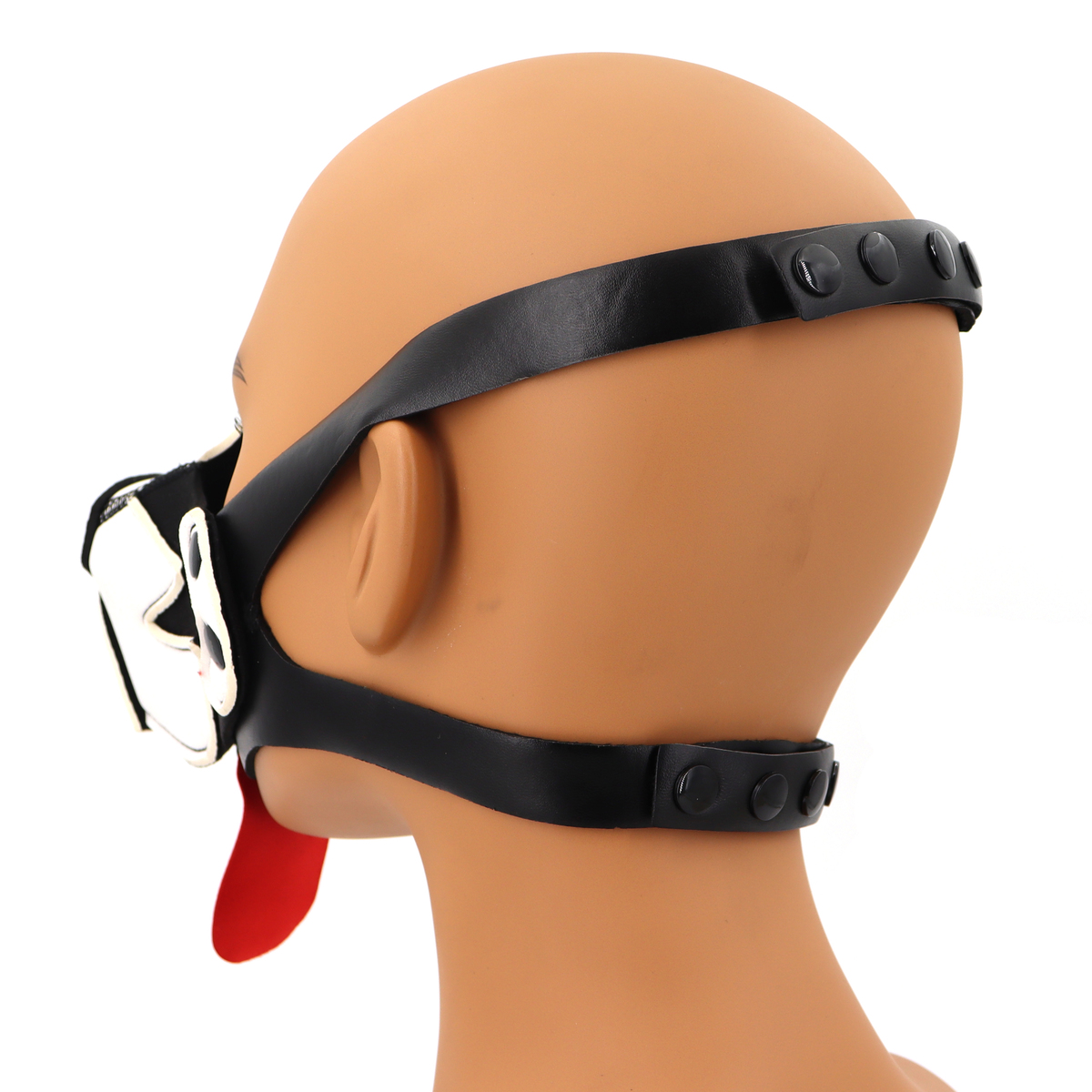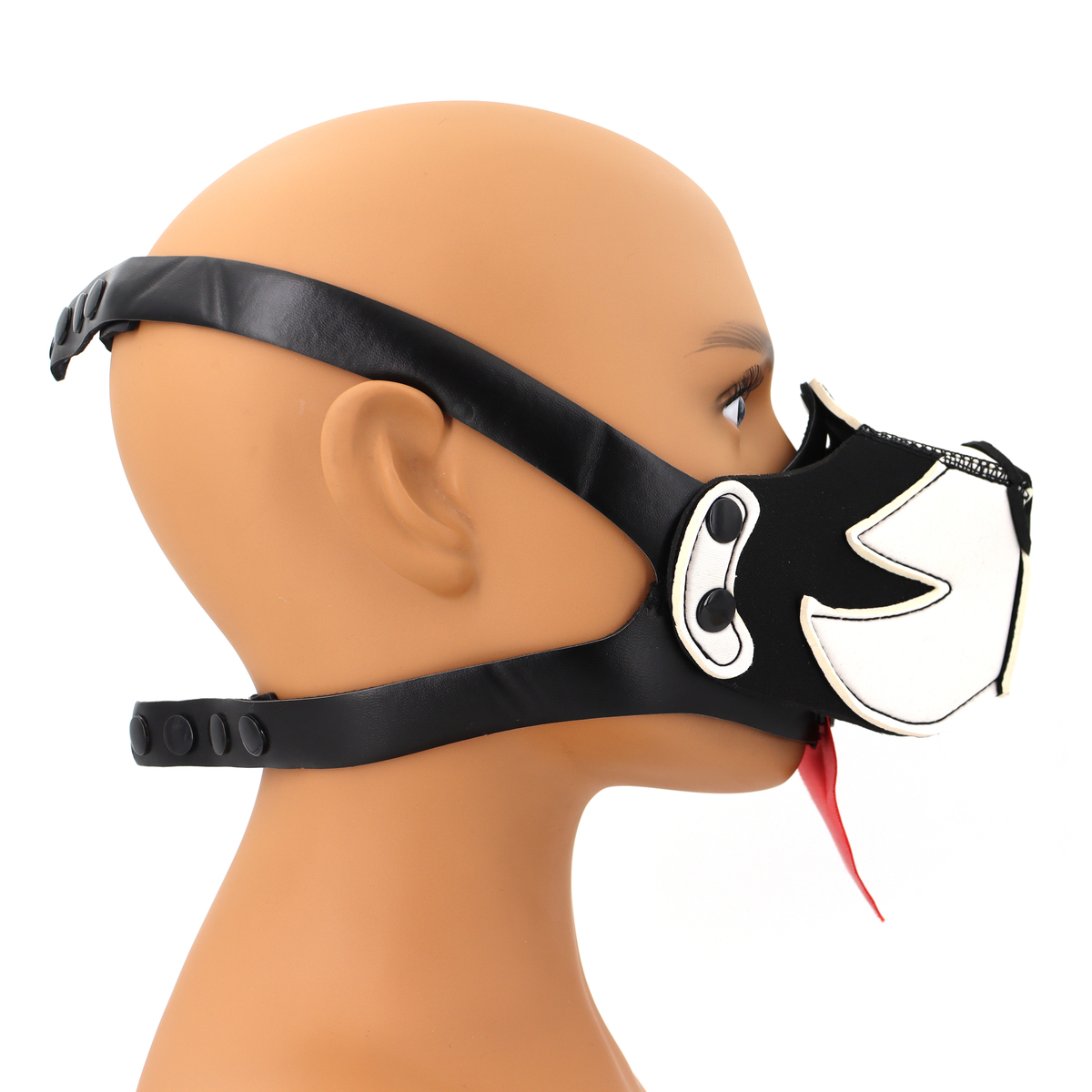 The Puppy Dog Mouth Muzzle is soft and stretchable. No zippers or fuss with cords to fasten. You click it together with the snap on buttons over your head and it fits.The muzzle can be attached without the tongue on one of our neoprene puppy masks we sell separately.The puppy mask is made neoprene material. You can remove the muzzle, because of the press stood this is easy. Because the mask is made of neoprene it closes well around the head, without it feeling loose. It can withstand water and is easy to clean. Because the muzzle is perforated and open at the bottom, it is easy to breathe, and can be worn for a long time.You can even click on the included tongue. The puppy mouth mask is very comfortable to wear.This BDSM half face mask shouldn’t be missing from your collection if you like puppy play.Color: Black + White/RedMaterial: Neoprene + Faux LeatherSize: 13.0 * 8.0 cm/5.12 * 3.15 inchStrap Length: 53-76 cm/20.9-29.9 inch 39-52 cm/15.4-20.5 inchNet Weight: 59 g/0.13 lb/2.08 oz