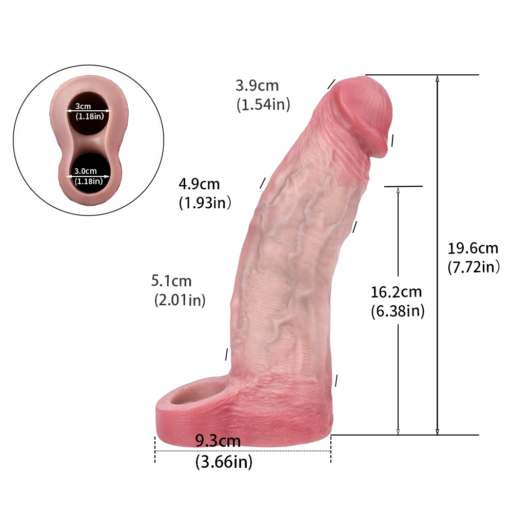 Go from satisfying to mind-blowing! This flexible & realistic penis extender fits over your shaft, instantly adding your length and boosting your width too! The ribbed interior adds stimulation and creates natural suction you??ll love. A stretchy ball strap keeps it on securely, so you can thrust away with confidence.Function: Penis Extension SleeveColor: FleshSize: 19.6 * 4.9 cm/7.72 * 1.93 inchInsert Length:16.2 cm/6.38 inchNet Weight: 244 g/0.54 lb/8.61 ozPower: NoMaterial: SiliconePackage: OPP BagFurther: Soft/Non-toxic