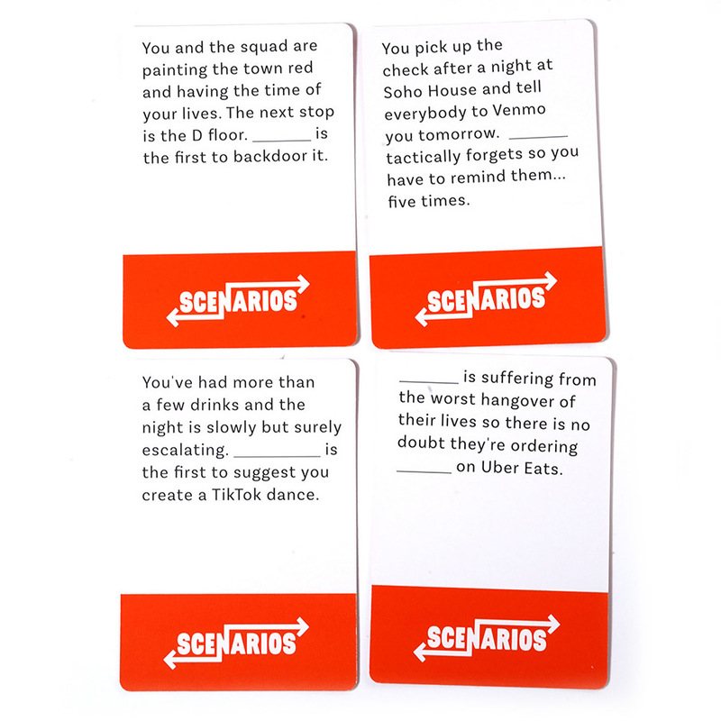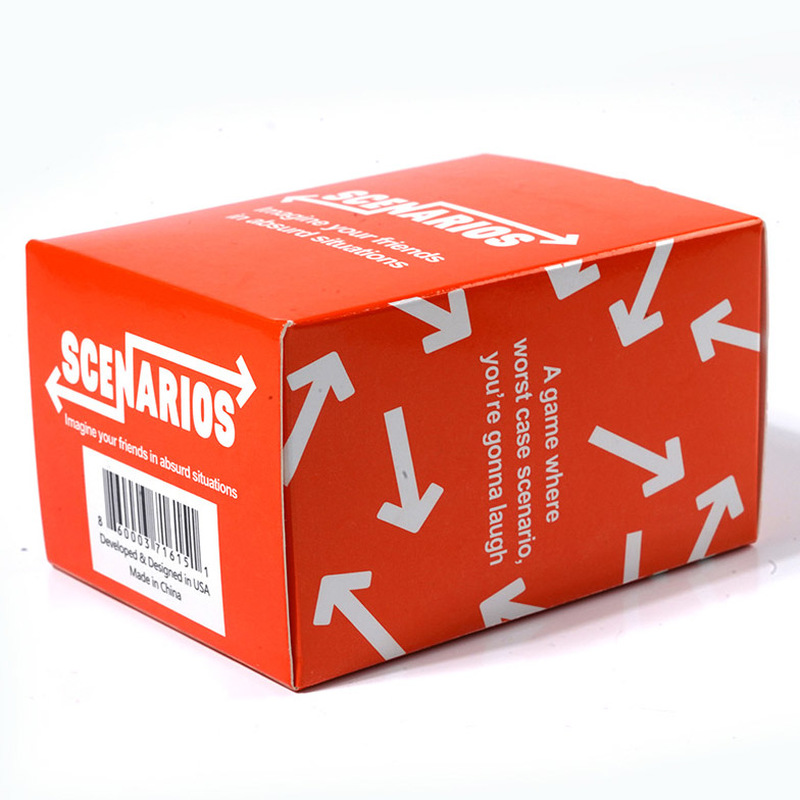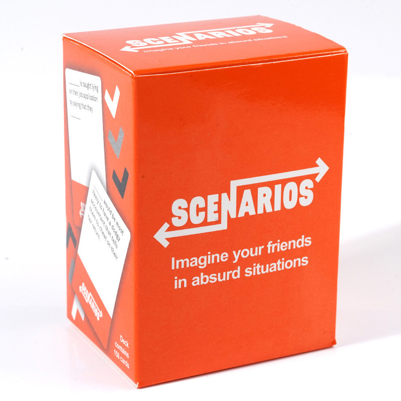 Scenarios is the game for adults that brings spontaneous humor back to game night. Freestyle a hilarious situation for your friends and see how it ends up. The question is: do your friends know what you actually think of them?! How to Play: The adult card game couldn??t be simpler! Draw a card with a scenario, then fill in the blanks on the card using the name of any player from the group and how they’d react to the situation. Tell the group the scenario and let them judge it with a thumbs up or down.