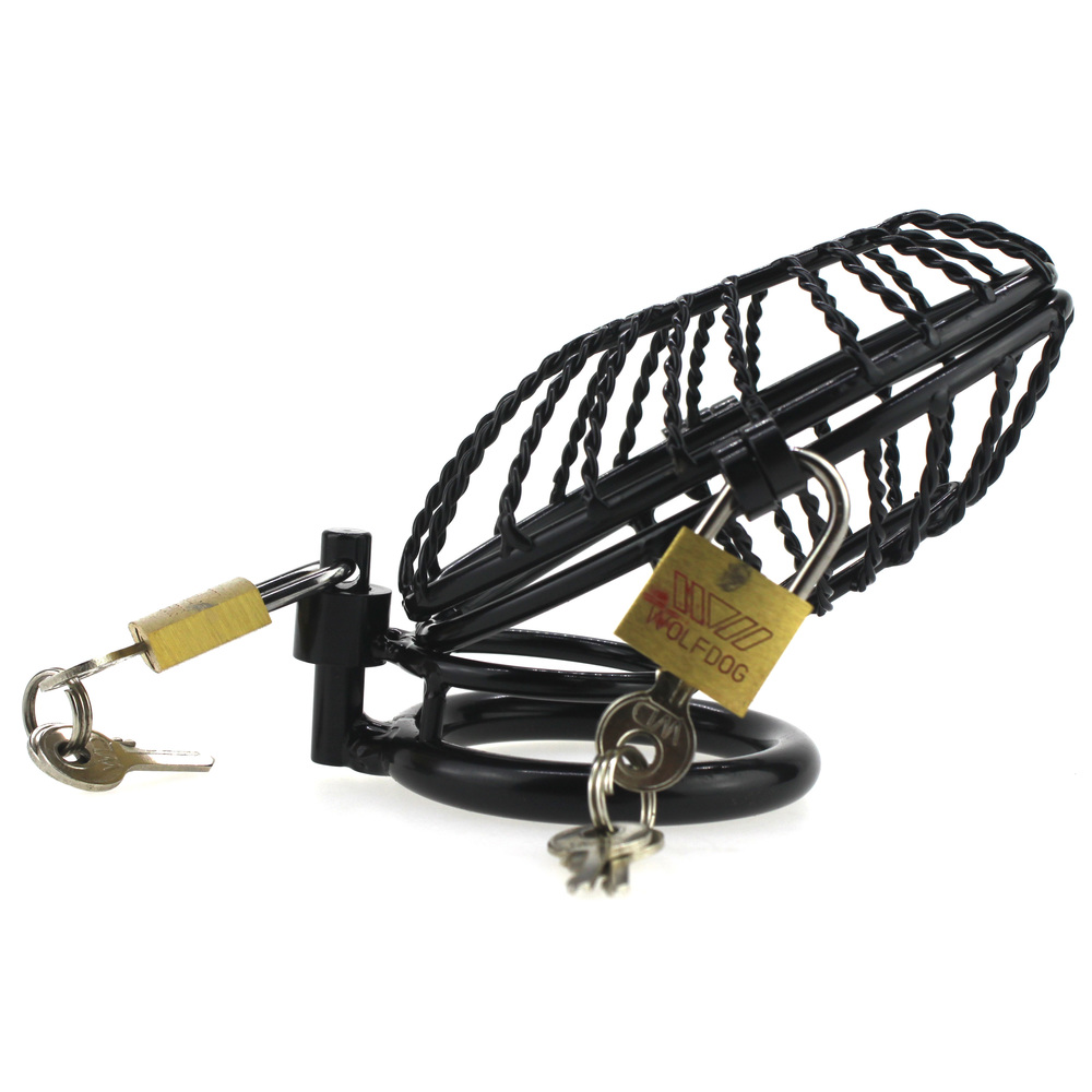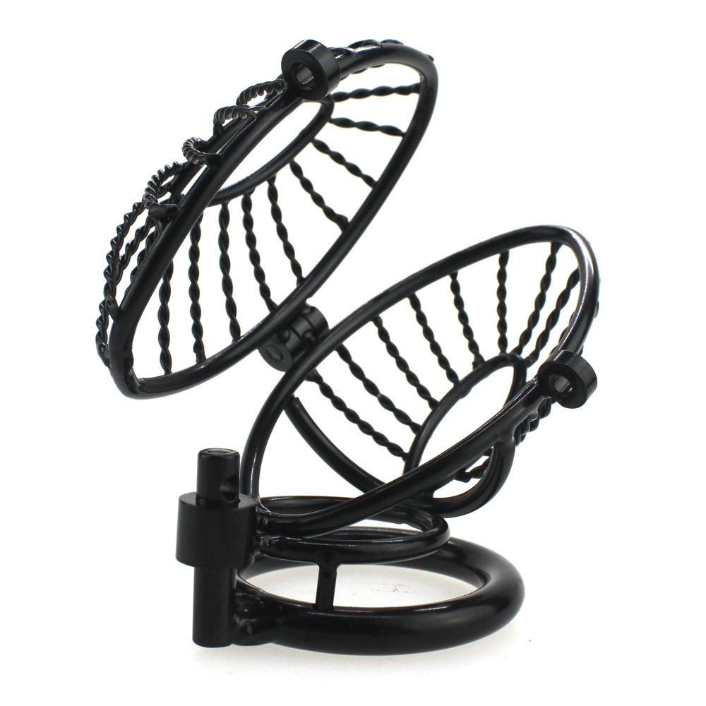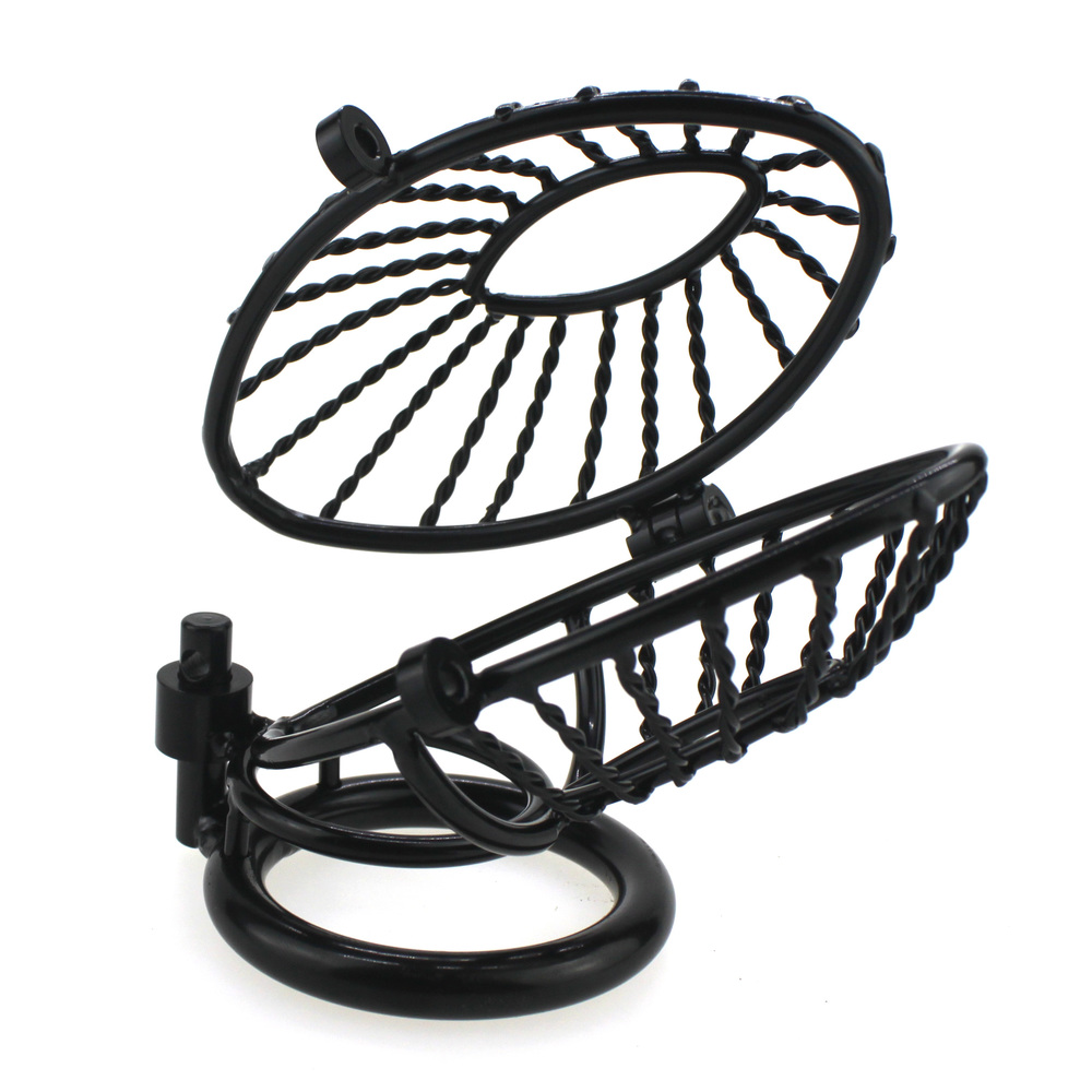 Side Entrance Black Twist Stainless Steel Seed Pod Chastity Cage. This innovative side opening design with black twisted steel is a stimulating experience you won??t forget. Make it a part of your bondage collection. Inside diameter of the cockring is 45 mm. The length of the steel cage is 110 mm. Enclosed in delivery are two padlocks (one padlock locks the cockring, the other padlock locks the cage itself) with three keys each.