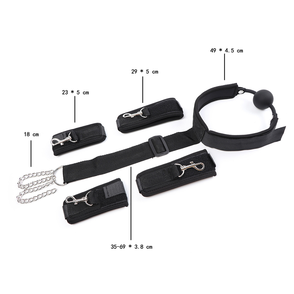 Material: Nylon + SiliconeColor: Black/RedCollar Size: 60 * 4.5 cm/23.6 * 1.8 inchGag Dia: 4 cm/1.6 inchContact Belt: 25-48 cm/9.8-1.9 inchWrist Cuffs: 41 * 4.8 cm/16.1 * 1.9 inchAnkle Cuffs: 46.5 * 5 cm/18.3 * 2 inchPackage: OPP Bag