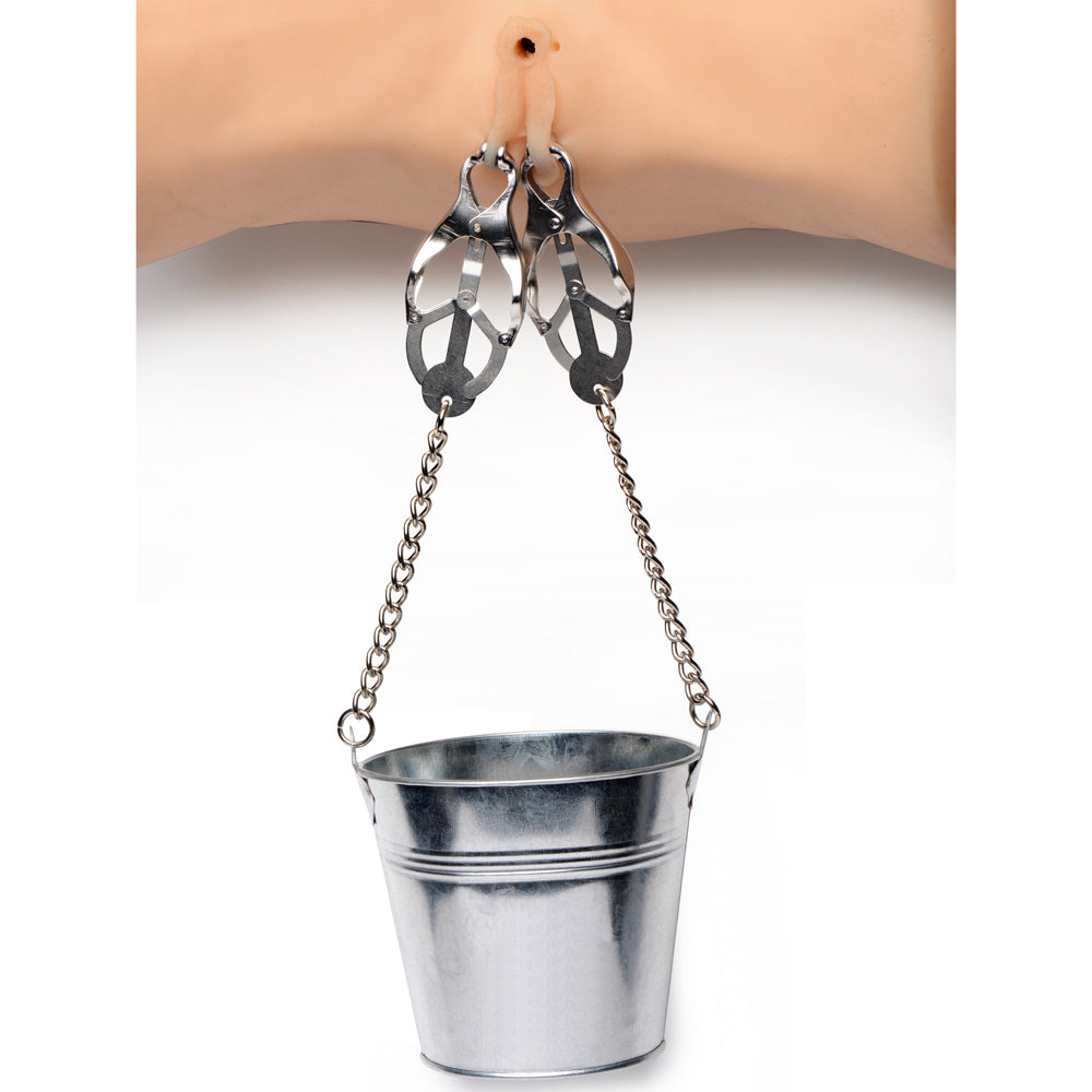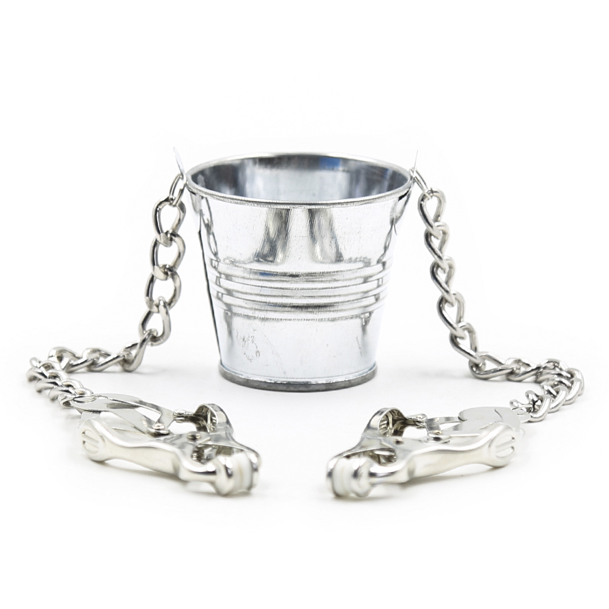 The Slave Bucket is the perfect BDSM accessory for wicked games with your partner. Combining the design of classic clover clamps with a bucket that hangs from chains, the more weight you add, the stronger the pinch and pull will be. Tease your sub with each pebble, coin, or drop of water that goes into the bucket. This devious device is perfect for nipples or labia, but can be used anywhere you desire! Material: Metal Color: Silver Size: Clip length 9cm/3.5in bucket length 5cm/2.0in Package: OPP Bag