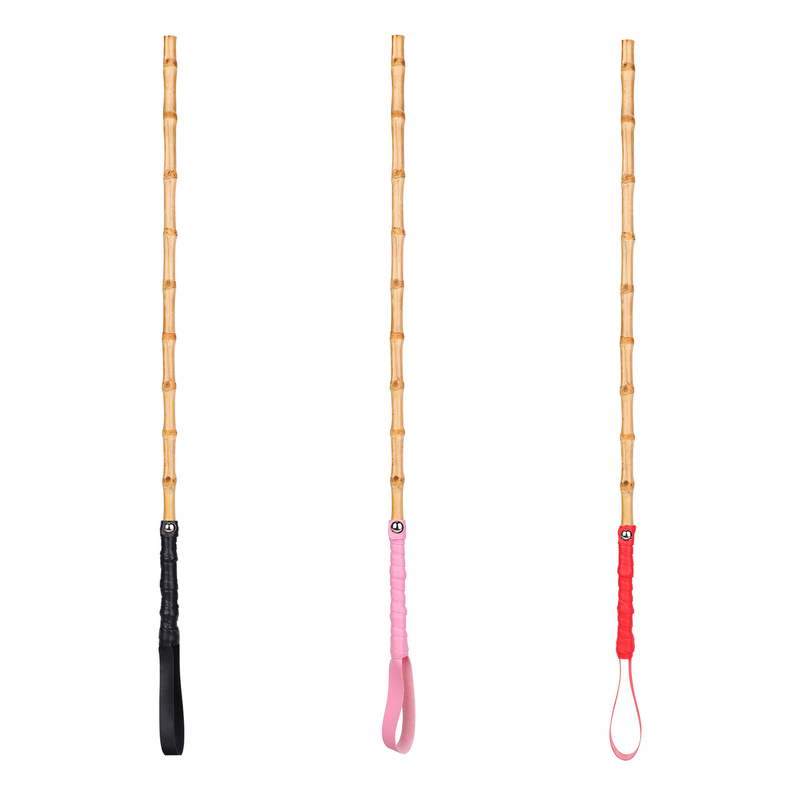 The canes are made of bamboo, characterized by its segmented appearance and natural, light brown color. The loops, typically made of leather,provide a secure grip for the handler.Material: Faux Leather + BambooColor: Black/Red/PinkSize: 66.0 * 1.5 cm/26.00 * 0.59 inchPackage: OPP Bag