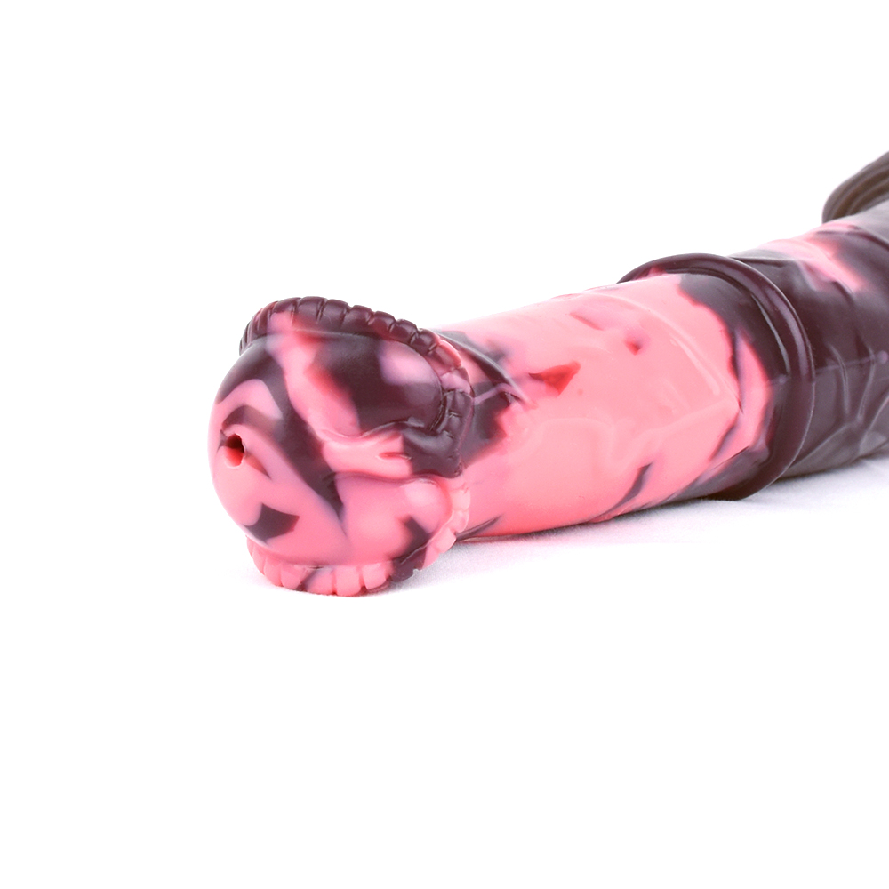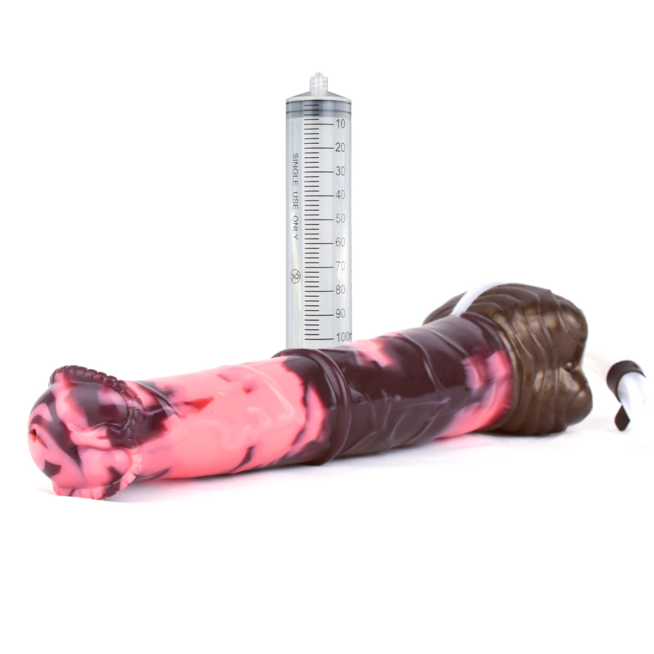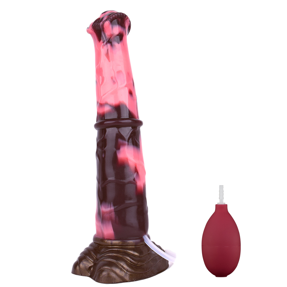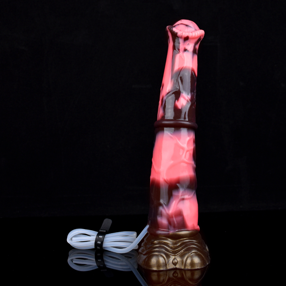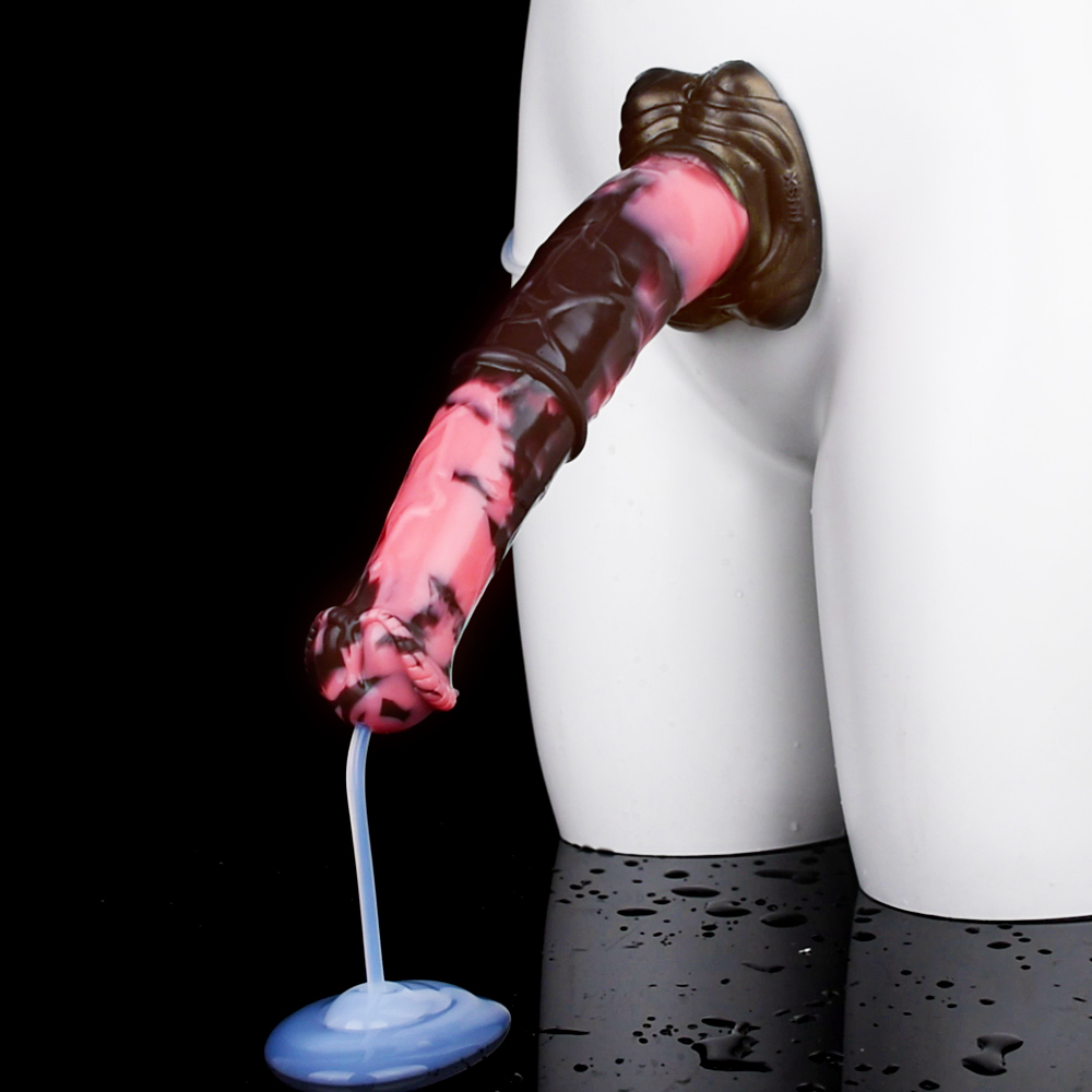 The Squirting Steed Dildo is a dildo coloured in Primal Desire, a marbled pink and black gradient. This horse inspired dildo features a flat head and a massive veined shaft, getting thicker near the base. It also has a cumtube that can be used to simulate ejaculation. This dildo is perfect for those who are looking for enormous dildos to conquer.