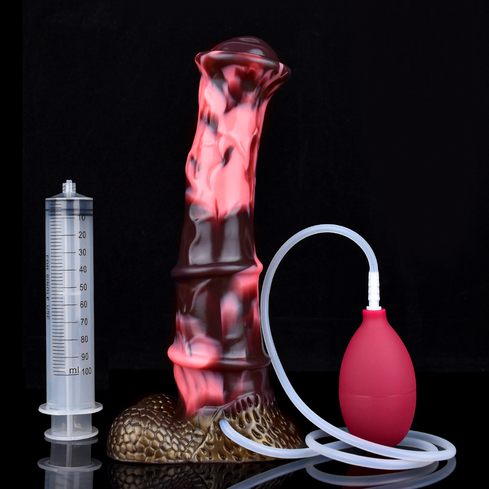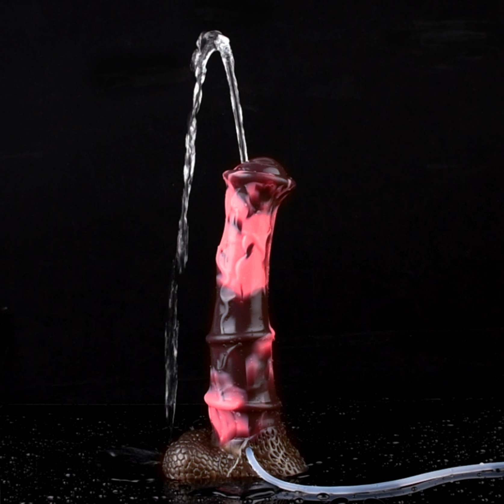 The Squirting Steed Dildo is a dildo coloured in Primal Desire, a marbled pink and black gradient. This horse inspired dildo features a flat head and a massive veined shaft, getting thicker near the base. It also has a cumtube that can be used to simulate ejaculation. This dildo is perfect for those who are looking for enormous dildos to conquer.