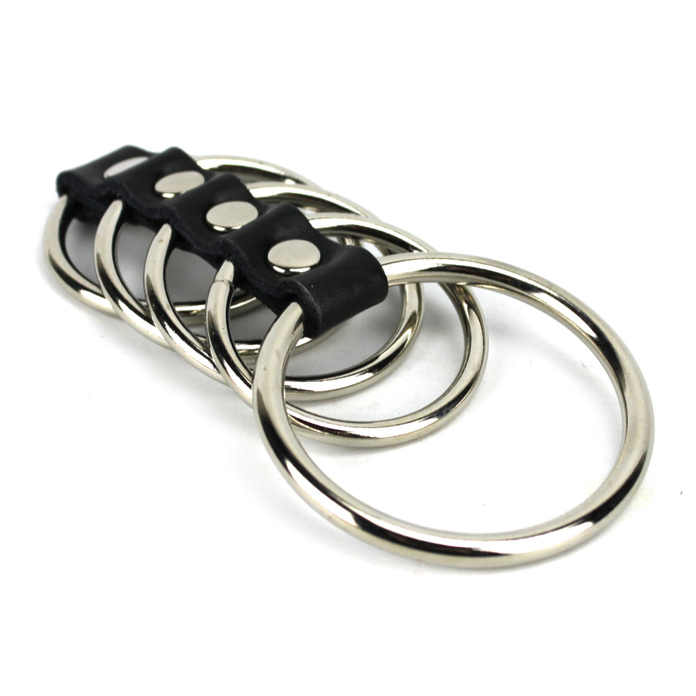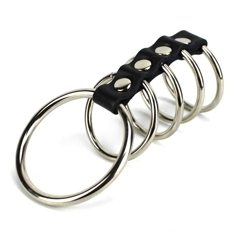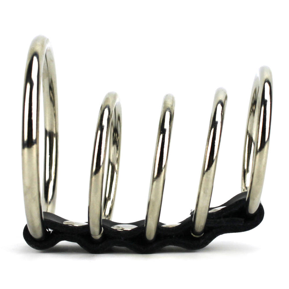This device is used for male constraint/adornment.It consists of a series of nickel-plated steel rings connected by a leather strap. The first, largest ring goes over the cock and balls, and the cock alone goes into the other rings.The rings get progressively smaller, confining the penis. This 5 ring version starts with a 1?” ring, followed by two 1?” rings and two 1?” rings. The entire length is about 3″.Black: Rubber RingSilver: Metal Ring