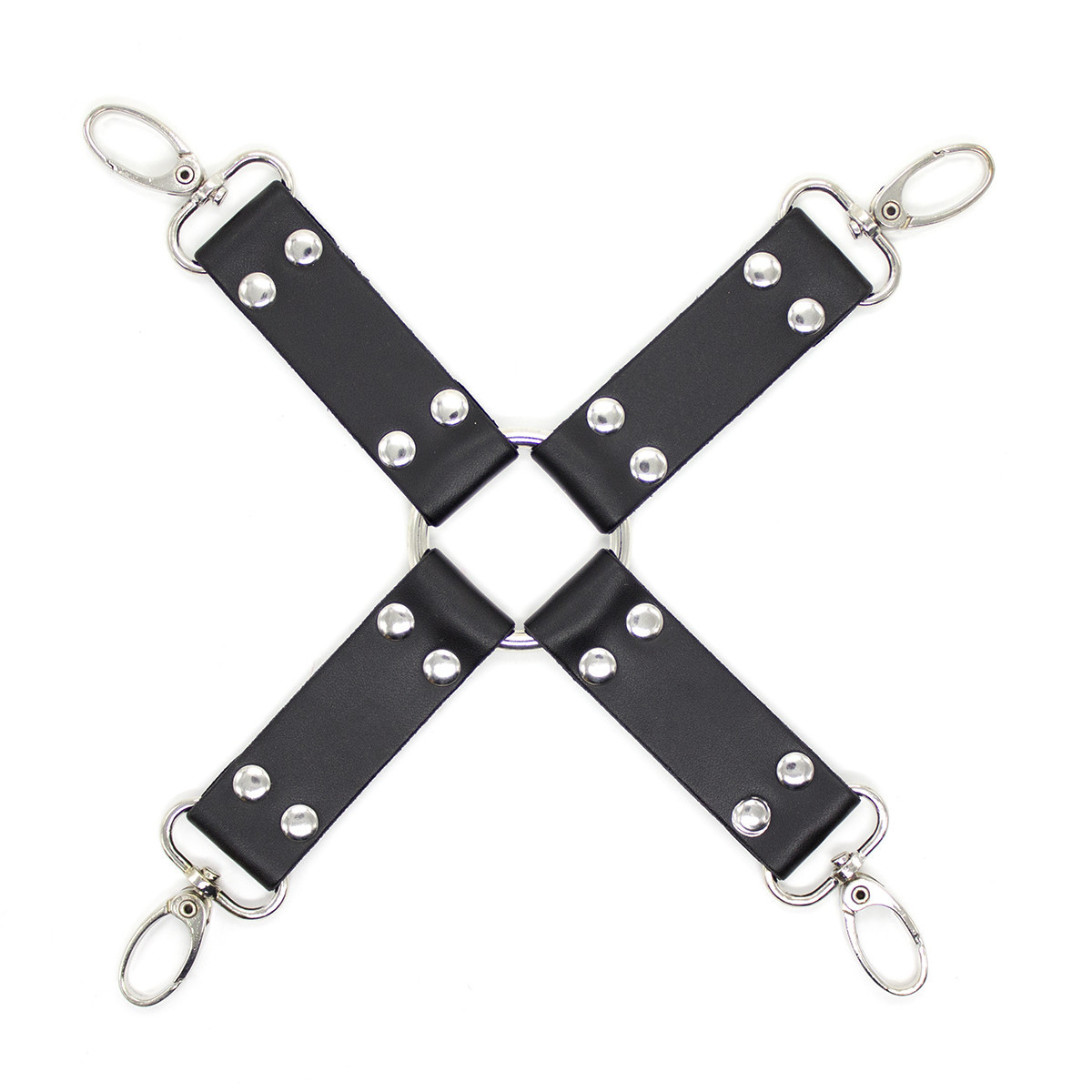 A super quick and easy way to hog-tie. Just snap the snaffle hooks onto the D-rings of wrist and ankle restraints. The 11 inch spread and rotating snap hooks are connected by sturdy leather straps.
