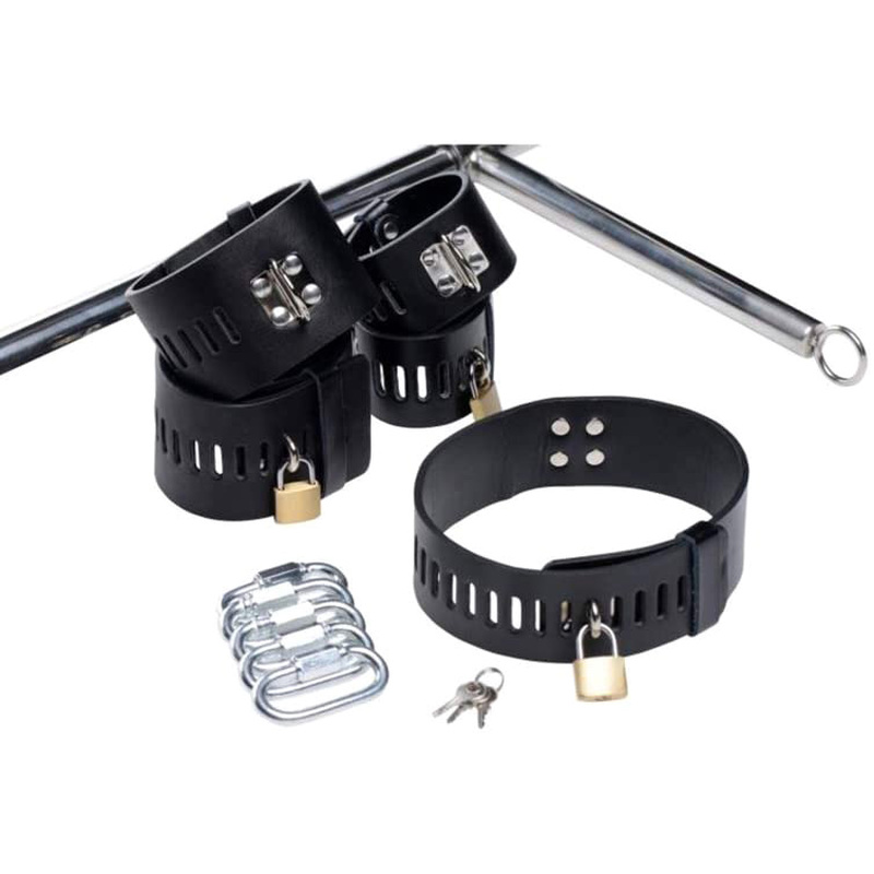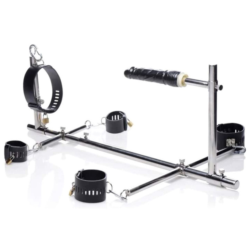 Punish and please your plaything in this deviously distinctive twist on a stockade! Restrain your lover by their neck, both wrists, and their ankles as they are penetrated by a veiny black cock! All parts of this remarkable contraption are adjustable, so you can extend the base bar, customize the height of the dildo and collar, and alter the locations of your lovers wrists and ankles. Construction couldn’t be easier, with simple screw-tight connecting tubes. The luxurious, heavy-duty cuffs are all finished with a locking bracket to ensure that they cannot escape, and a D-ring for connecting them to the stockade or even use in other bondage scenes! Enrich your BDSM fantasies as they come to life with a unique instrument for locked-down penetration. Measurements: Base bar adjusts from 26 to 47 inches. Wrist bar is 10.5 inches across. Ankle bar is 20.5 inches across. Height of dildo adjusts from 1.5 inches from base to 11.5 inches from base. Dildos protrudes 11 inches from bar. Insert able portion measures 7.5 inches in length, 1.75 inches in diameter. Collar adjusts from 13 to 18.5 inches in circumference. Wrist restraints adjust from 6 to 8.5 inches in circumference. Ankle restraints adjust from 6 to 11.5 inches in circumference. Material: Stainless steel, aluminum alloy, PU leather. Color: Grey. Note: Includes 7 bars to fit together, collar, wrist restraints, ankle restraints, dildo, 5 lock and key sets, and 5 connectors.
