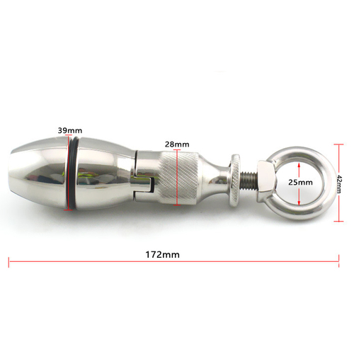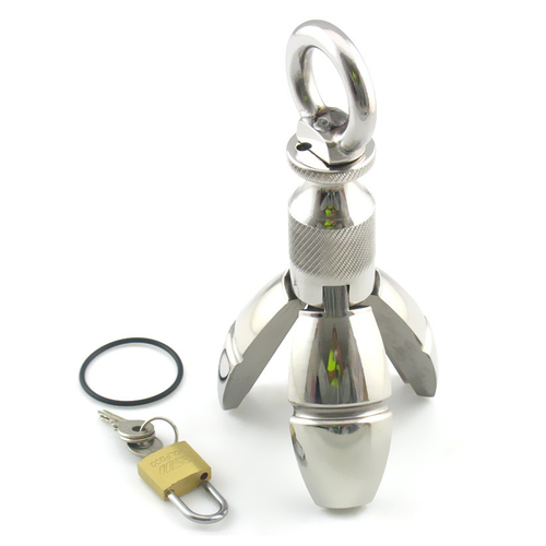 There have been anal plugs; plugs that insert into the anus and offer a visual appeal in addition to the stimulation. The Anal Lock creates a new dimension in anal play. When inserted, the wearer can feel the metal travel every inch of the cavity. Once fully inserted, a simple push of the back portion of the plug causes the inserted portion to expand.