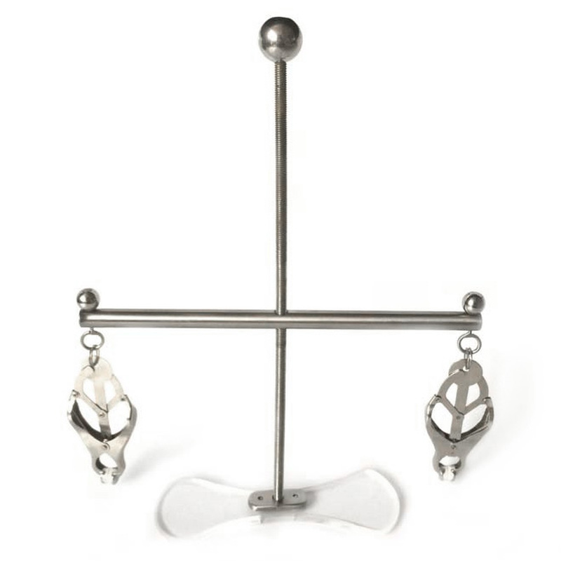 Take nipple play to the next level with The Tower of Pain. A simple yet very efficient design to help you squeeze and pull on your subs nipples. The Tower of Pain includes to two Japanese Clover Clamps at each end of clear rod. Once claps are attached to their nipples, place the rest plate ontop of there sternum and then screw in the ball rod and start stretching their nips Simply turn the ball to pull the clear rod further away from their chest, making the clover clamps pull more. Keep them on the edge as they see you reach for the ball to turn it. Tower of Pain disassembles very easily for you to put away and put away or pack in your luggage.Color: SilverMaterial: Stainless Steel + ABSPackage: BagBar Dia: 1 cm/0.4 inchesTop Ball Dia: 2 cm/0.8 inchesHeight: 22 cm/8.7 InchesWidth: 21 cm/8.3 InchesBase: 14 * 5 cm/5.5 * 2 Inches