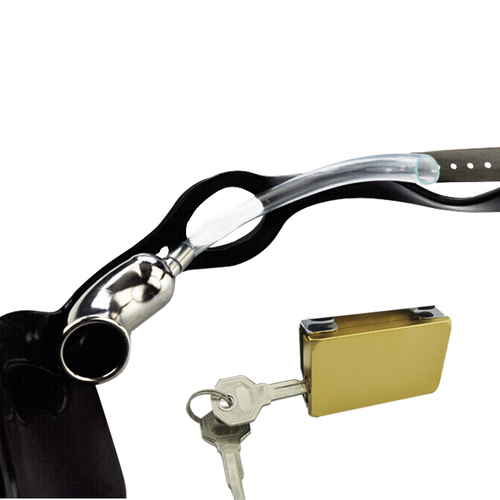 The waist belt fits from 33″ – 43″. The crotch strap is also adjustable for the perfect fit and locks on. A small brass disc covers the locking post before the padlock is inserted to cover the hasp of the padlock. This not only looks great, but adds a level of security to make it even harder to get at the hasp in order to cut it off.