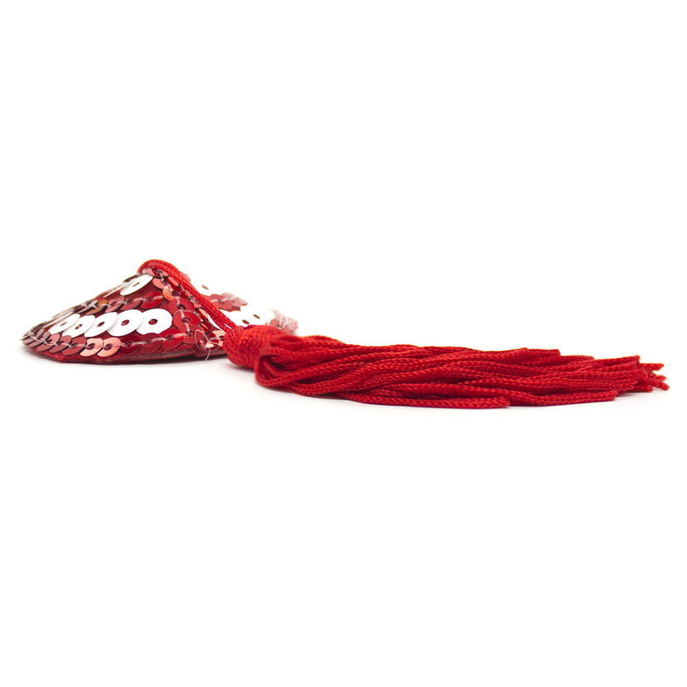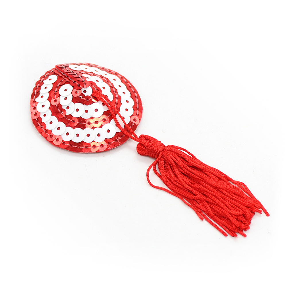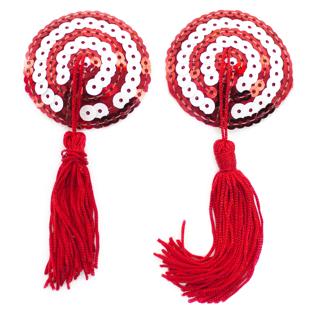 You are now under my control, self adhesive red and white sequin circle pasties with tassle detail.