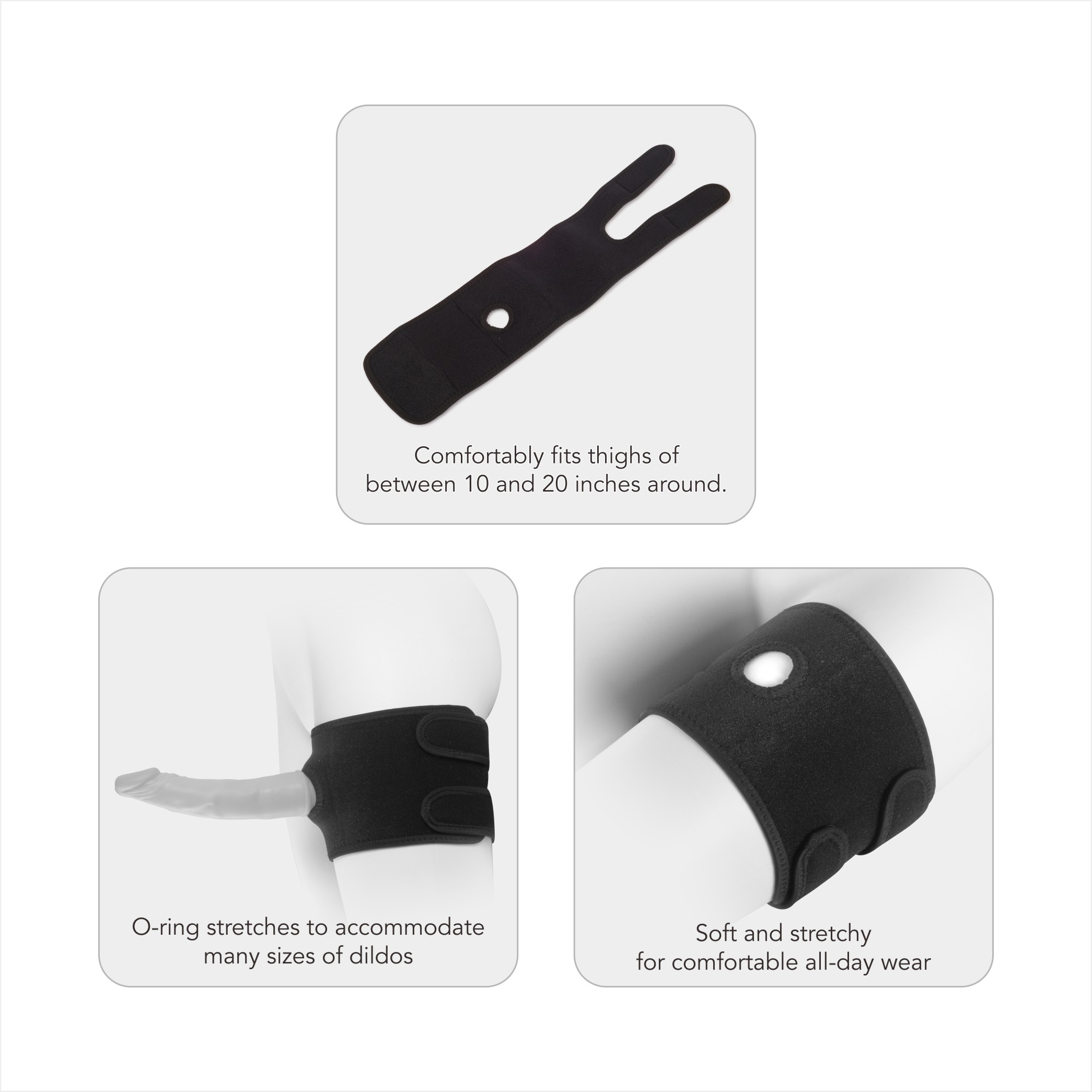 Give your lover the ride of their life when you strap a dildo or vibrator to your thigh with this user-friendly leg harness. Adjustable and comfortable to wear, it lets you experiment with a range of positions and attachments for a sensational wild ride.As the harness is adjustable from 10-20 inches around, all you need to do is pop your favourite toy through the 1.5 inch O-ring and strap it onto your partner’s leg.You set the pace and pleasure, while they get the show of a lifetime!Key featuresAdjustable Velcro-fastening leg harness for versatile strap-on play.Ideal for use with dildo or vibrator for exciting couple’s play.Comfortably fits thighs of between 10 and 20 inches around.Compatible with a wide range of dildos and toys with a flared base.Made from cushioned, machine-washable material for maximum comfort during use.O-ring stretches to accommodate many sizes of dildos.Essential Info:Please note: Dildos not included.Material: PolychloropreneSize information: 10 – 20 inch in circumferenceO-Ring Dia: 1.5 inchLength: 21.5 inchPackaged Size:17×12.5×5.5 cmPackaged Weight:0.12kg
