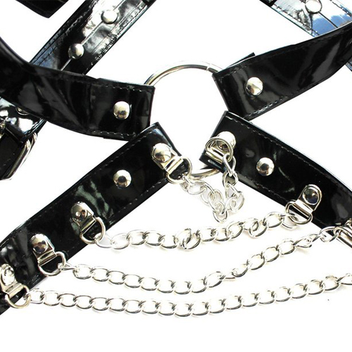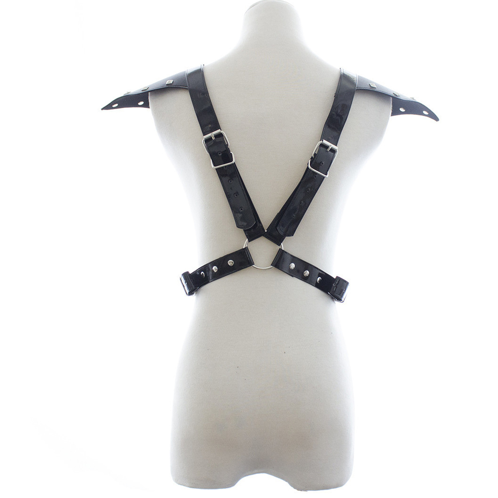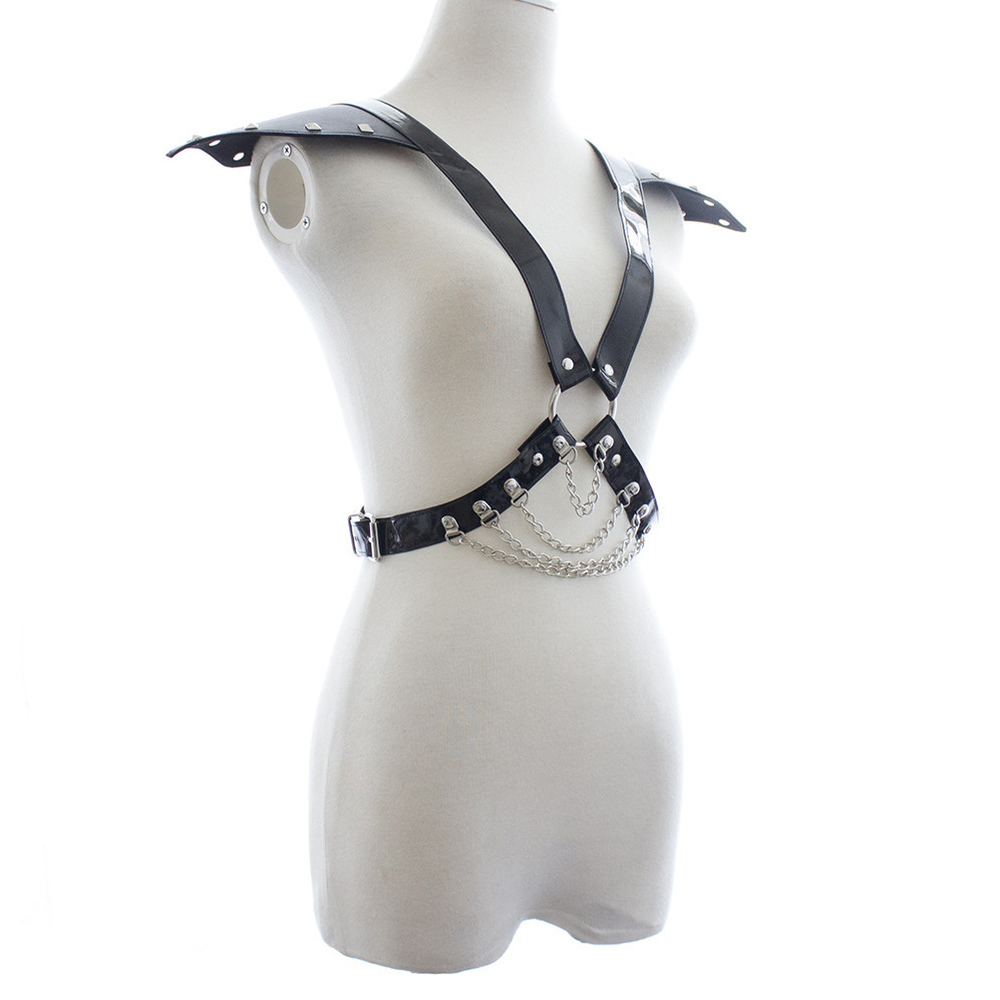 Genuine black leather body harness with shoulder wings and shiny metal body chains. Available in one size 248 – size adjustable.